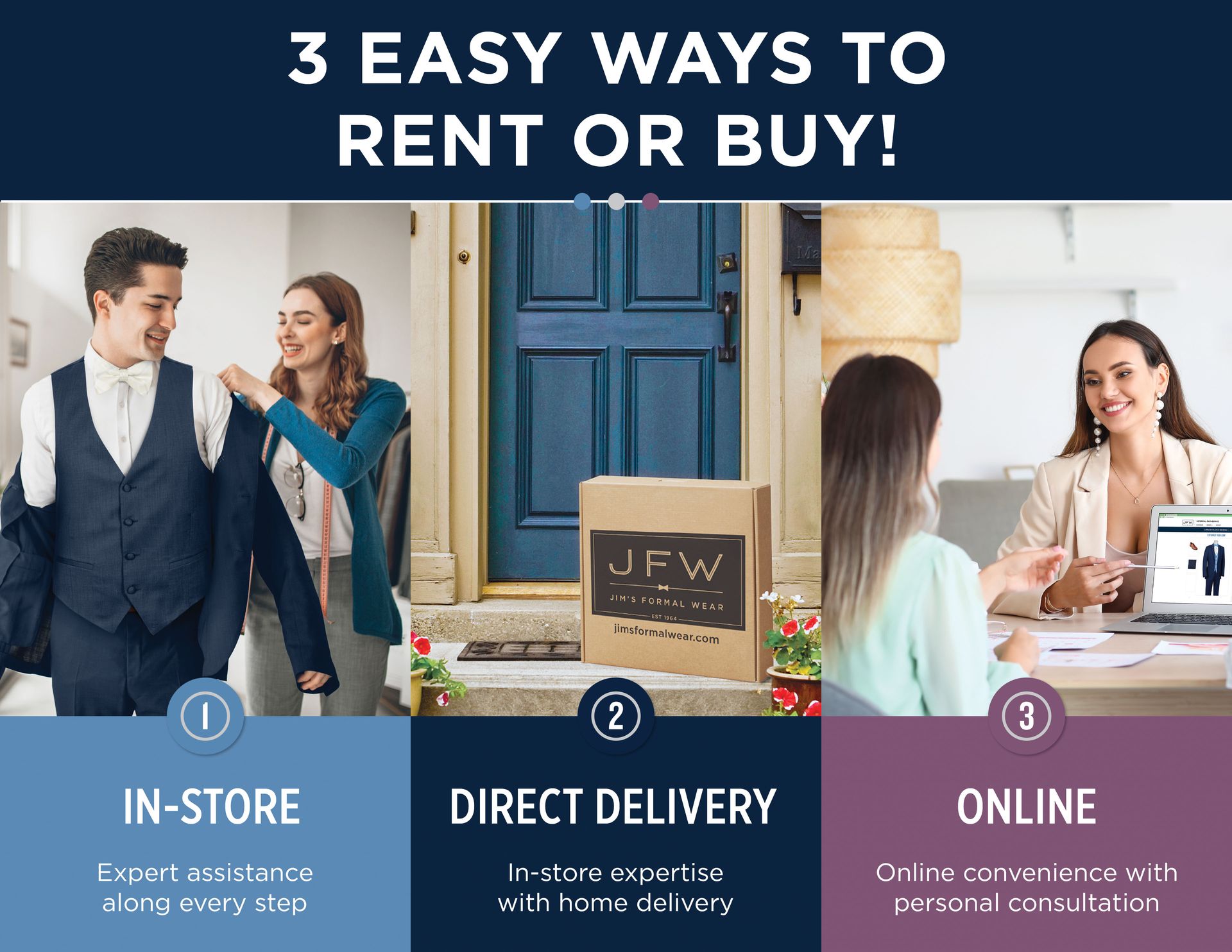 No need to visit us in person-- simply contact us for a smooth at-home experience. Rent or buy your chosen look, get measured from the comfort of home, and have your outfit shipped directly to you.